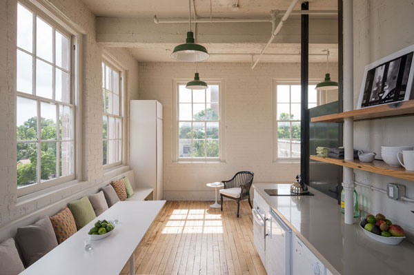The Textile Mill (circa 1894) is located in the former industrial center of the Houston Heights. Following a long period of neglect, the current owners obtained the building, began planning for the renovation of the block long complex, and secured its listing on the National Register of Historic Places in 1983. The old mill, with its distinctive clock tower, had long been a neighborhood landmark and the architects were asked to restore the exterior while selectively renovating the interior to accommodate a mix of uses: lofts for working and living, retail, bakery, and a café.
