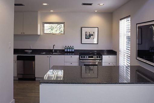 Buildings for living (1800 sq. ft.) and working (800 sq. ft.) share a common entry courtyard. The client has a diverse collection of ten thousand books which have become the focus of every room.